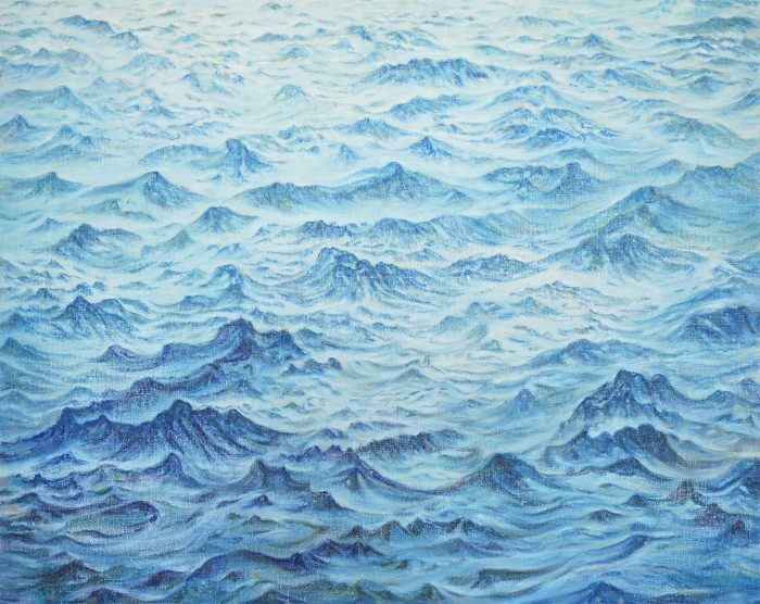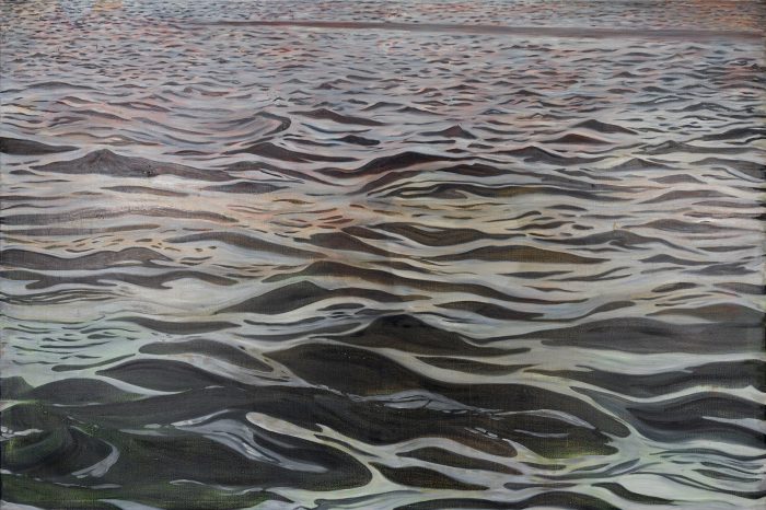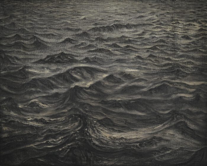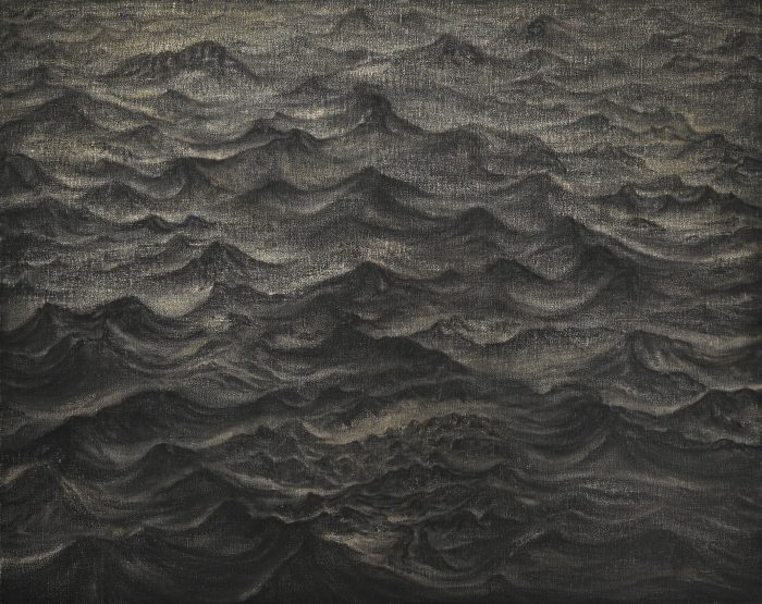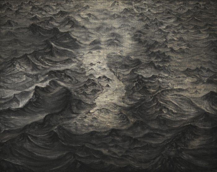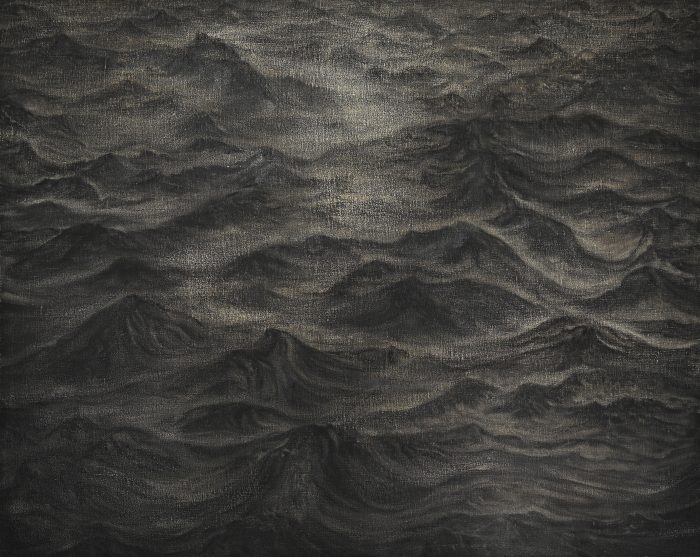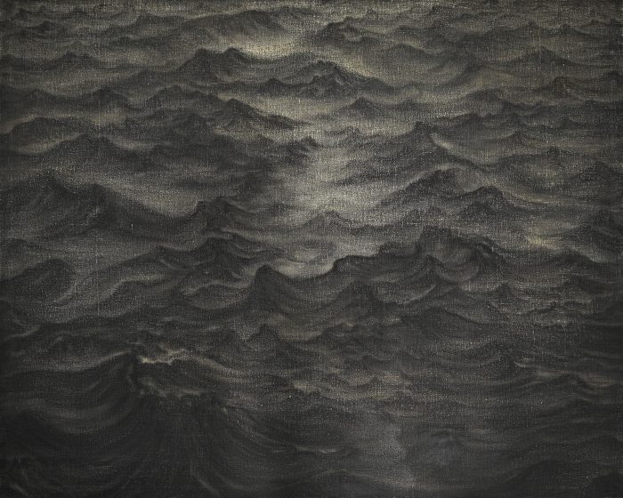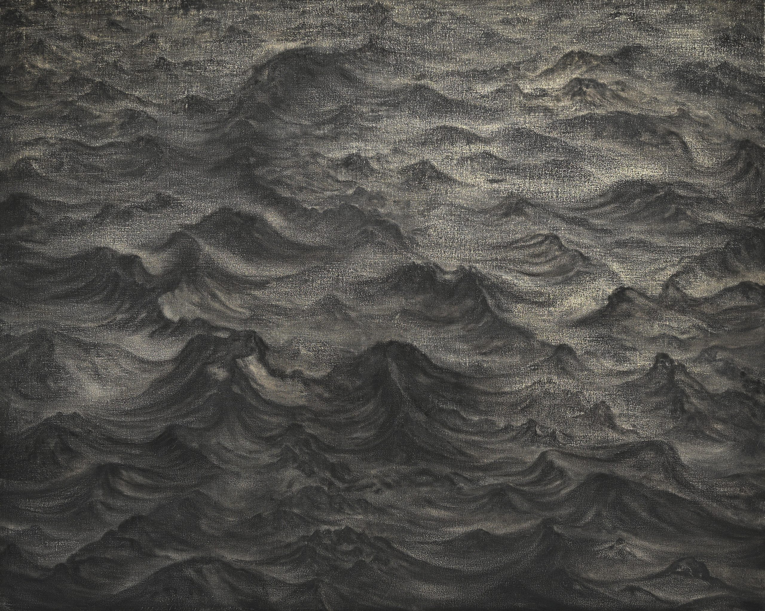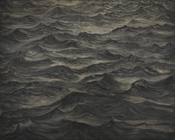在往返于柏林与北京度过双城生活的近些年里,孟煌从未割舍风景与自身创作语言的纽带。随着阅历的不断丰厚,孟煌也开始越发瞩目于纯粹且意涵广博的景物。于是水的意象逐渐频繁的出现在孟煌的画面之中,直至占据了他近年来几乎全部的绘画创作。去追溯九十年代《失乐园》系列时期的作品就会发现,其实有关水的伏笔早已埋下。在当时,水作为风景之中的局部被孟煌带有直觉性地取材。毋庸置疑的是那时的水由黑色染成,与孟煌画笔下的其他景色别无二致。在经过了二十年断断续续对水的描绘之后,直觉性慢慢为自发性所替代,由此水不再是有关水的风景本身,而是成为了被提炼之后的范式。